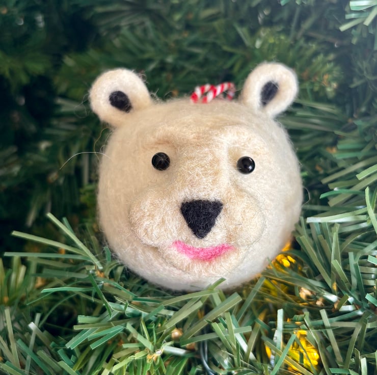 Large handmade needlefelted wool Polar Bear hanging bauble decoration with a red and white twine for the hanging loop.