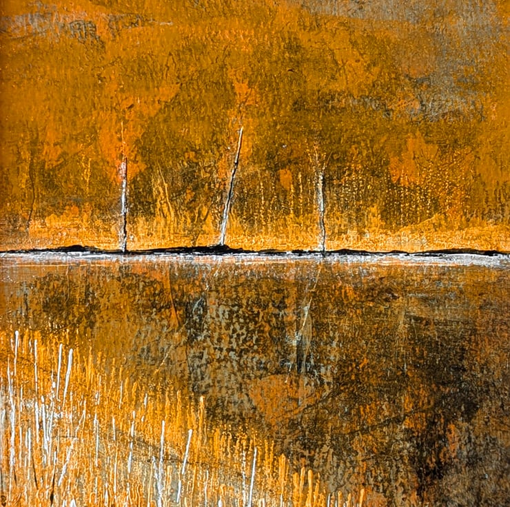 The first of four paintings in my Autumn Glow 2025 series is finished and up for sale. It's progress to completion has been featured on my YouTube Channel (deadartstudios) and is made form multiple thin layers of acrylic paint and gloss medium to give the painting a autumn glow. It is made using all my hallmark Deadartstudios techniques including; blade work, brushes and monoprinting. The first layers were laid down directly from printing with autumn leaves collected from nature. It shows an imagined and intuitively created semi abstracted landscape scene, featuring water and surrounding flora.