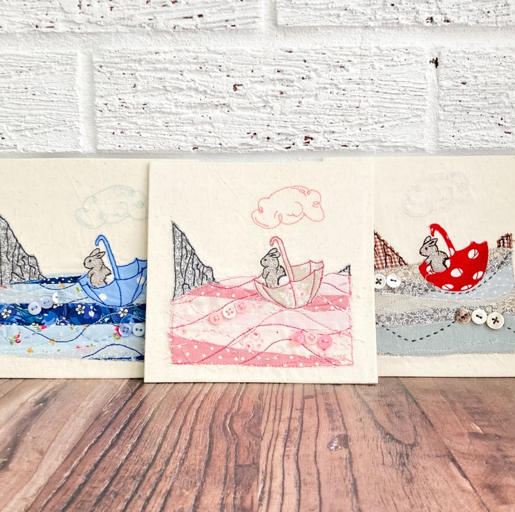 An original fabric applique and free machine embroidered design, embellished with hand embroidery and repurposed buttons. Photographed to a high quality and printed onto 150 gsm cardstock and laminated inhouse, with a matching satin ribbon attached.