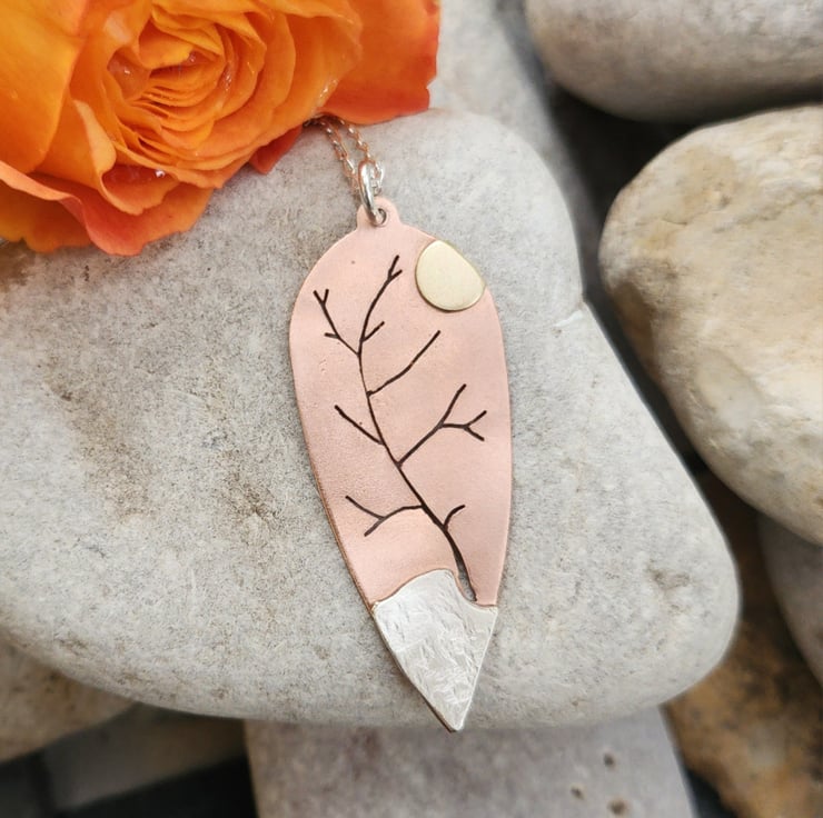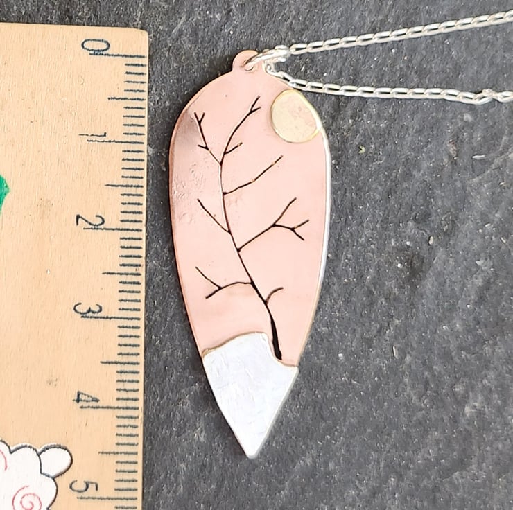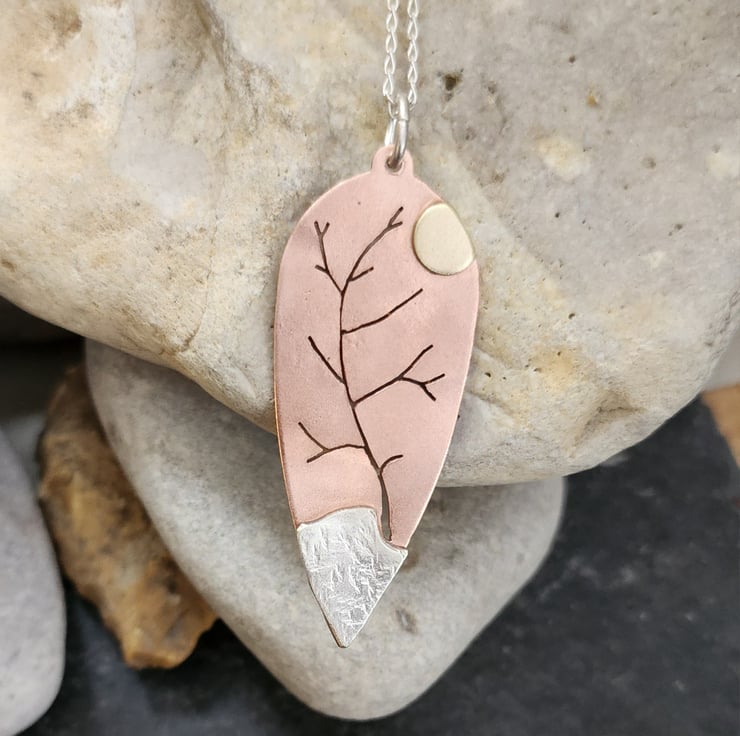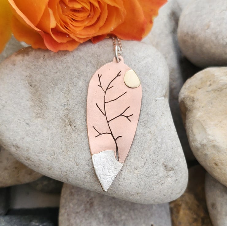 Copper drop leaf shape pendant, approximately 4.5cms long. The tree has been hand pierced into the copper with a fine-bladed jeweller's saw. A layer of silver has been added to the bottom to represent the snowy earth and a brass moon added to the top. Frosted effect on the copper. Finished with a 1mm diamond cut curb sterling silver chain, 16 or 18inch, please select which you would prefer when ordering. Care guide included.