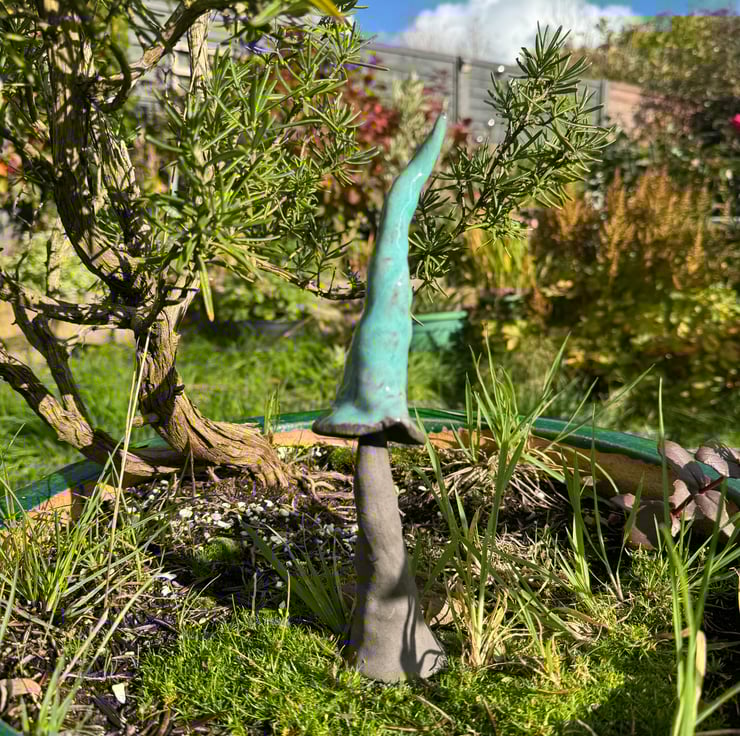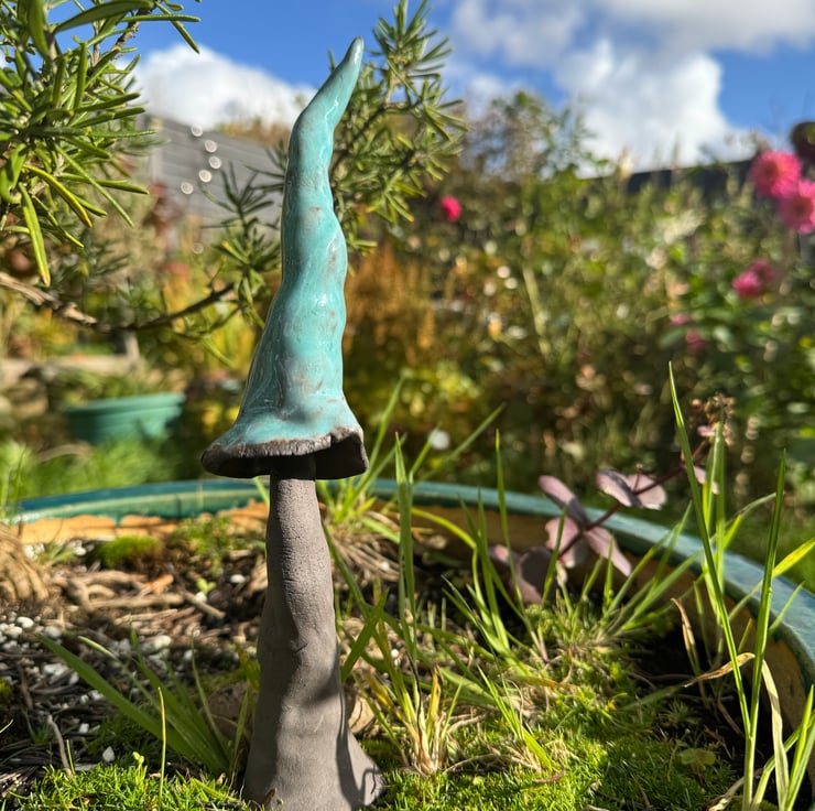 Simple yet effective, once the glazed blue cap is placed on the raw black clay stem this fungi measures approx 10”