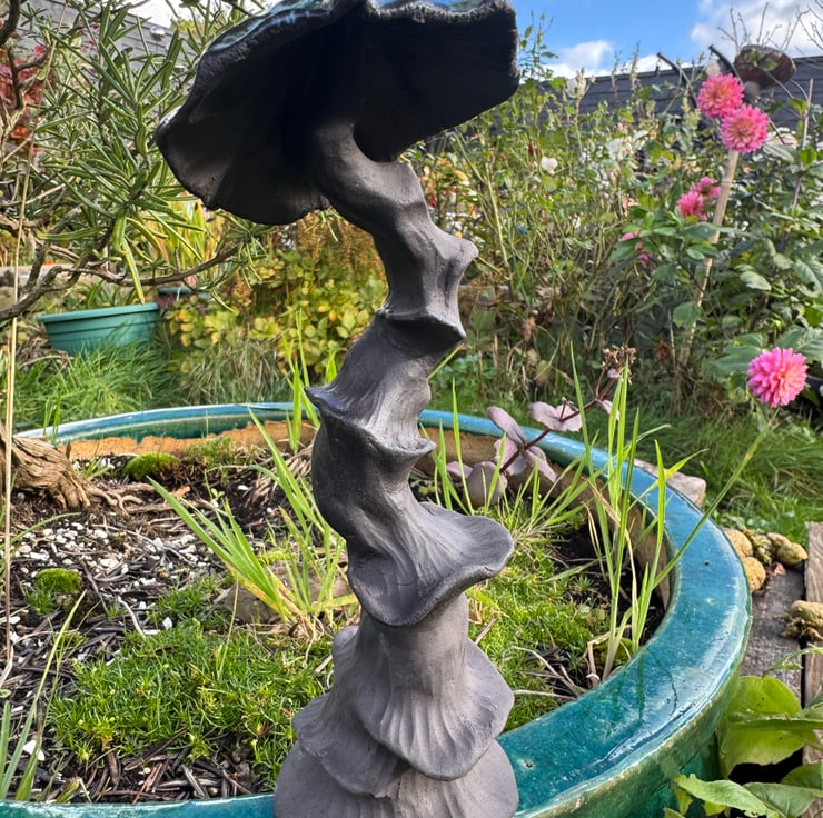 Twisting sculpted raw black stem and twisty glazed cap, measures approx 9” once put together. This fungi is particularly sassy