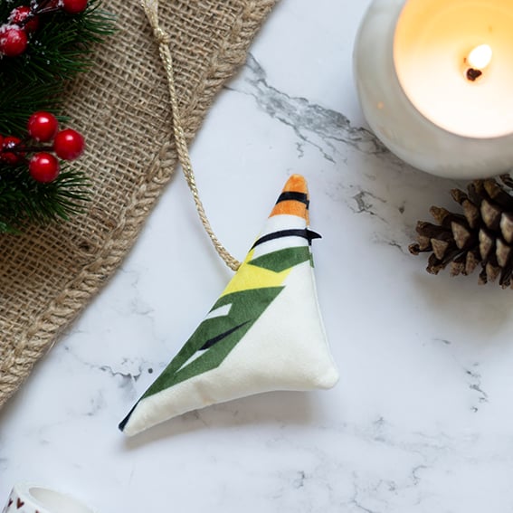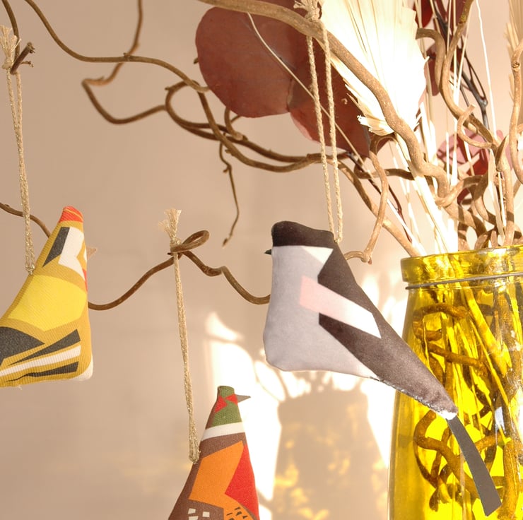 This flock of 6 captivating geometric bird hanging decorations, is meticulously crafted with a unique design, each hand made for individual charm. From the Velvet 4 featuring the Snow Bunting, Gold Crest, Chaffinch, and the Long-Tailed Tit with its distinctive Leather Tail, to the Denim 4 showcasing the Robin, Blue Tit, Bullfinch, and Goldfinch, and finally, the charming Cotton collection including the Partridge, Blackbird, Pheasant, and Waxwing, adorned with felting wool crests for added texture and personality.