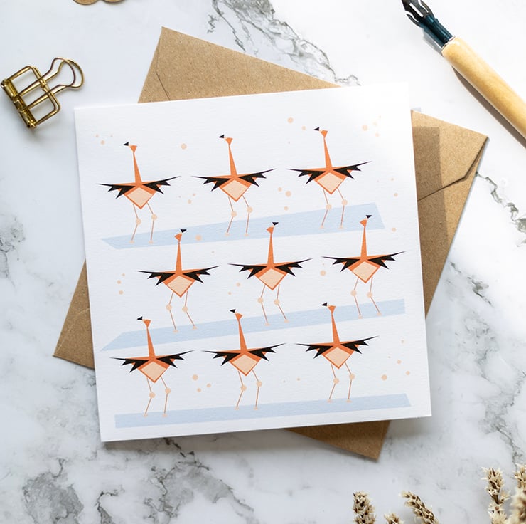Crafted with meticulous attention to detail, our cards feature delightful depictions of Seven Swans Swimming, Eight Pigeons with chicks, Nine Flamingos Dancing, Ten Sand Pipers, Eleven Guinea Fowl Leaping, and Twelve Drummer Birds. These intricate designs are sure to add a festive touch to your holiday greetings.