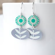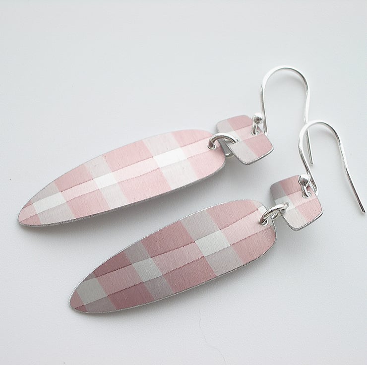 These oval shaped dangly earrings are made from anodised aluminium which I have hand dyed in ribbons of mink and taupe. I saw the shapes by hand and file and dome them so that they catch the light. They measure approximately 42mm x 10mm and dangle from sterling silver hooks and jump rings.
