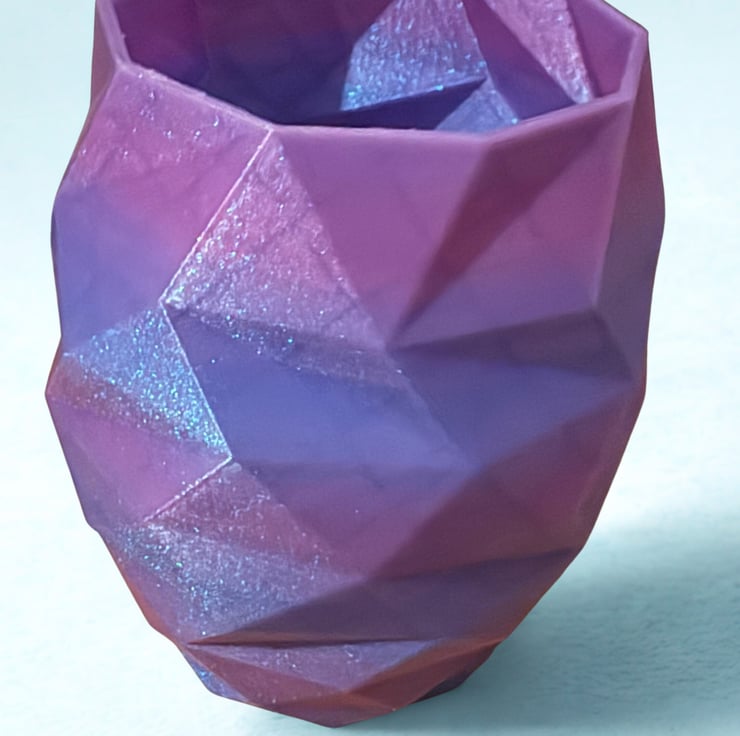 A striking, faceted vessel that seems to capture the quiet intensity of deep space. Its rich amethyst-purple hue is infused with a subtle, iridescent shimmer, causing light to dance across its angular surface like distant starlight. More than just a vase, it is a sculptural statement piece designed to draw the eye and infuse any space with an aura of modern mystery. The perfect home for a simple orchid or a bold, minimalist arrangement.