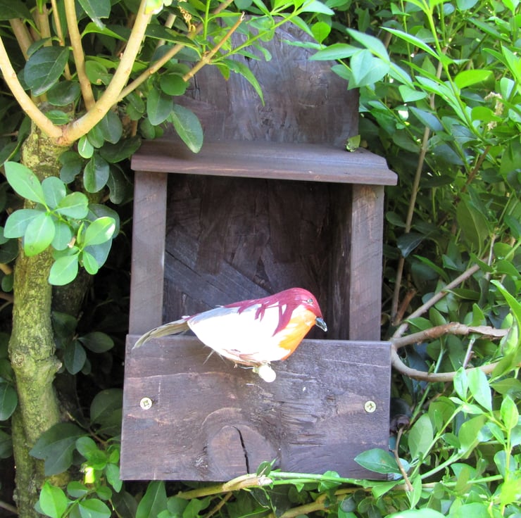 Robins are attracted to this design of nesting box - more so than the traditional style with the small entry hole which is more suitable for members of the Tit family