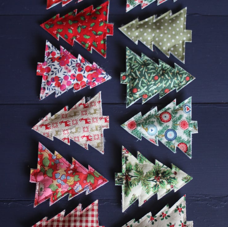 A set of twelve little Christmas trees stitched from leftover fabrics and designed to be pegged onto a length of twine to decorate your festive dresser or favourite shelf.