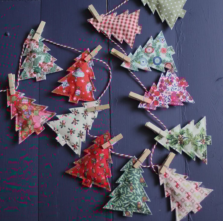 I have popped one of these little trees into Christmas orders over the last few years as a 'thank you'. As I was stitching this year's batch, I hung them up and it struck me that they looked pretty hanging in a row and, as I've made similar garlands in the past using hearts, stockings and flowers, I thought I would trial trees. I hope you like the finished result!