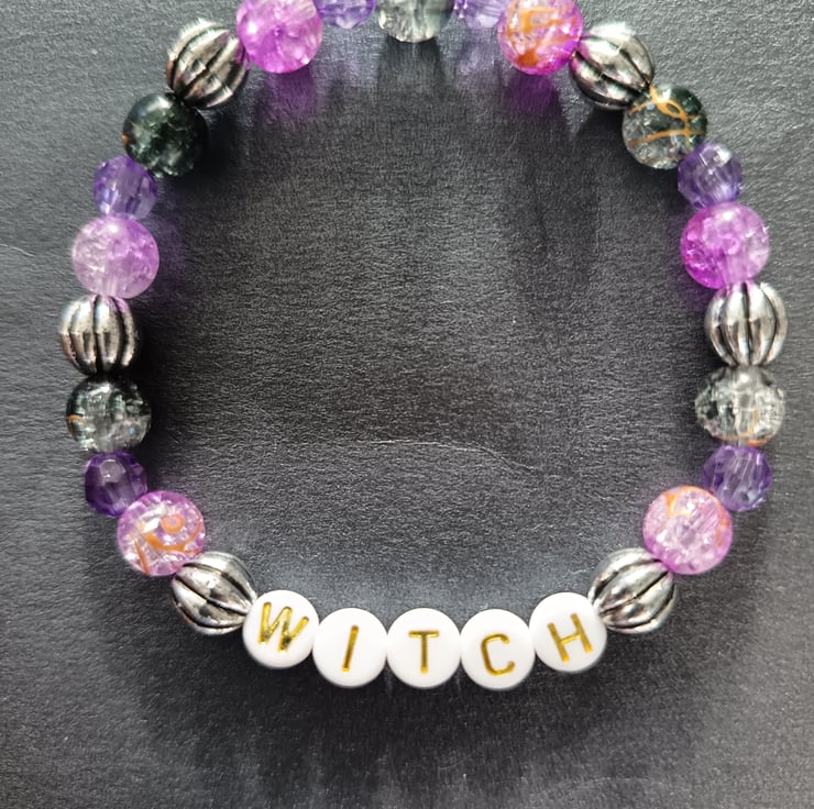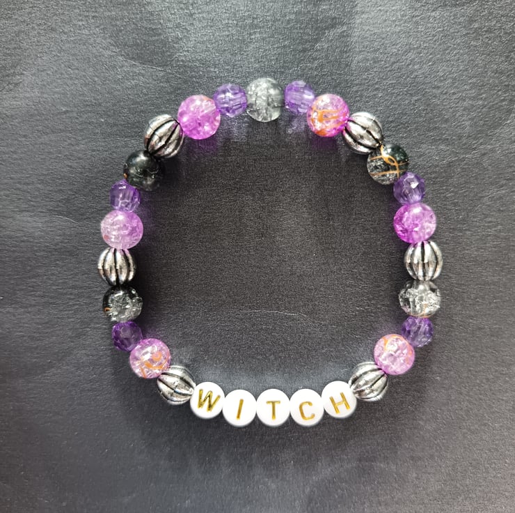 This handmade bracelet is crafted with magic stretch elastic, assorted purple and smoky charcoal grey glass and silver beads as well as white and gold lettered beads spelling the word "witch".