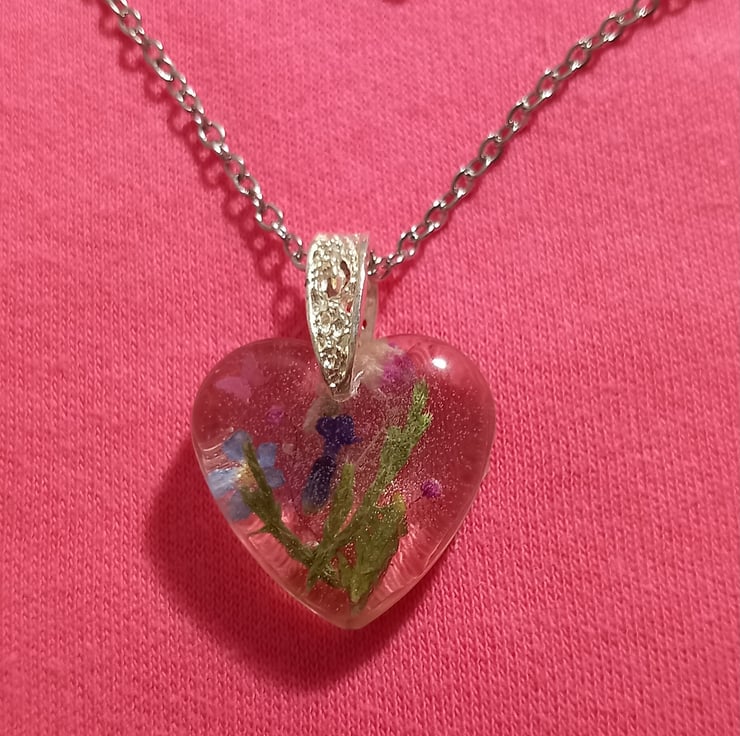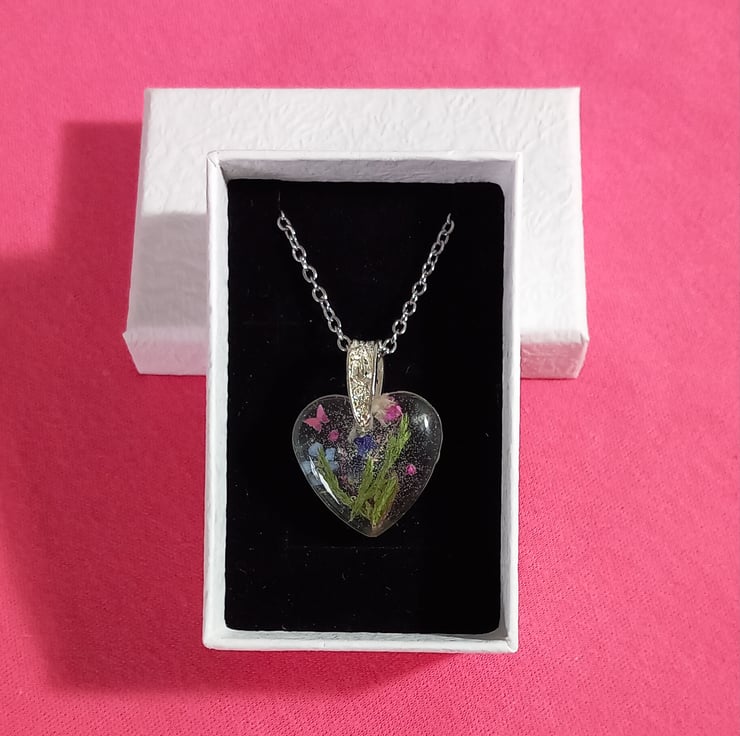 Tiny dried flowers & holographic Butterfly Encapsulated in a small resin Heart necklace