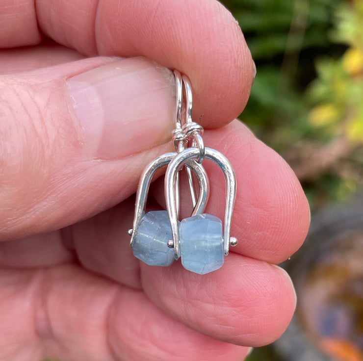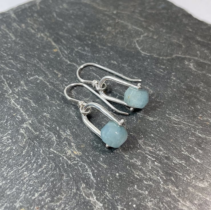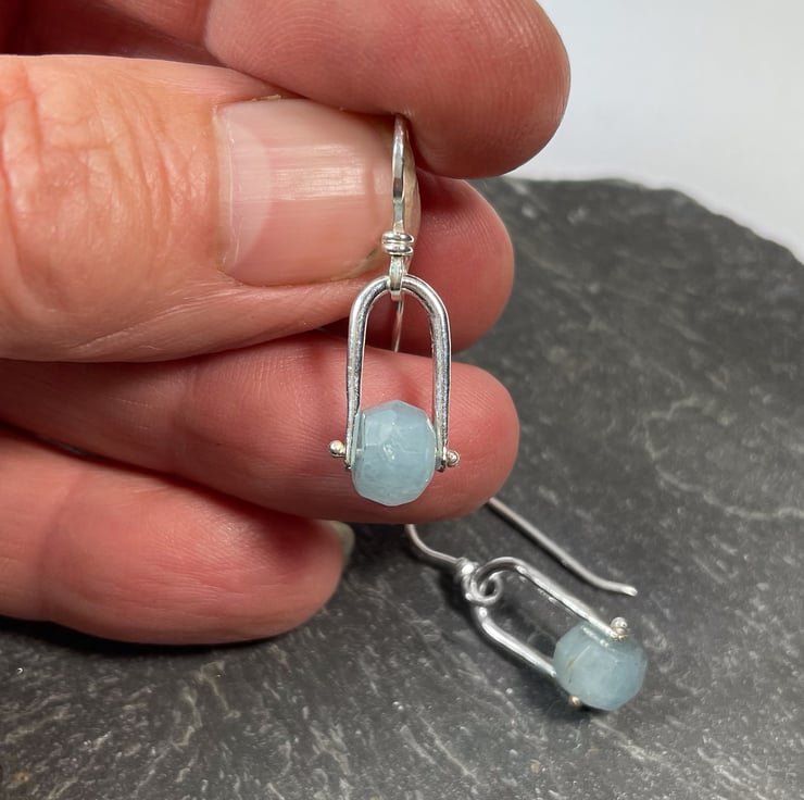 Sterling silver and faceted aquamarine small dangly castor like earrings on handmade hooks.
