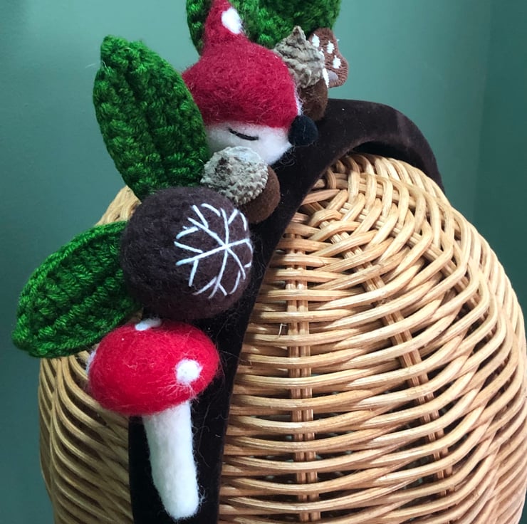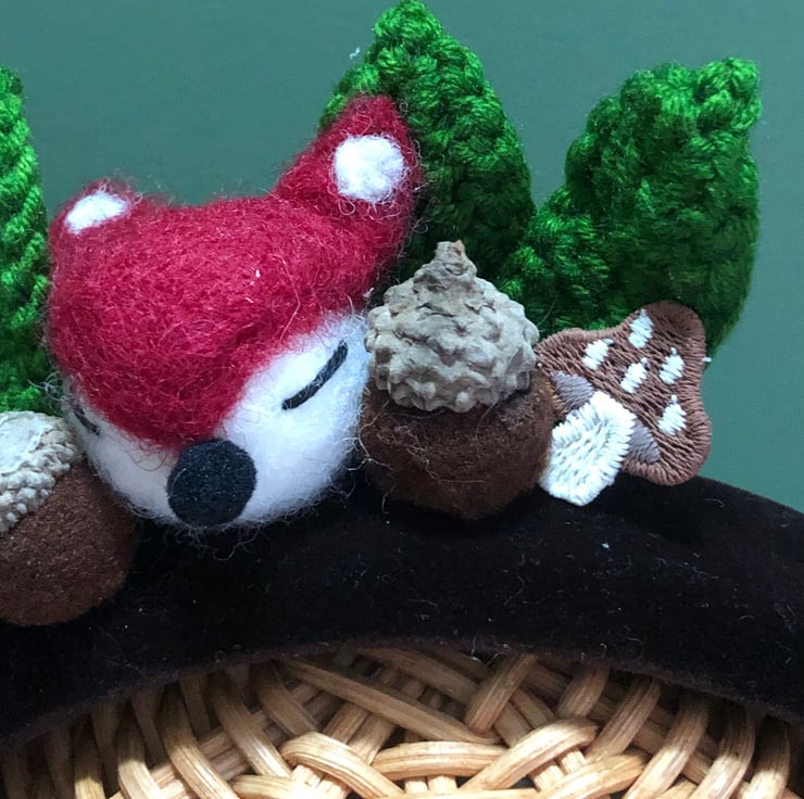 Step into an enchanted Christmas forest, this unique handmade headband has a sleeping felted fox nestled amongst a bounty of forest treasures, it’s all handcrafted with crocheted leaves a felted toadstool, it has a mix of soft materials and suitable for most head sizes