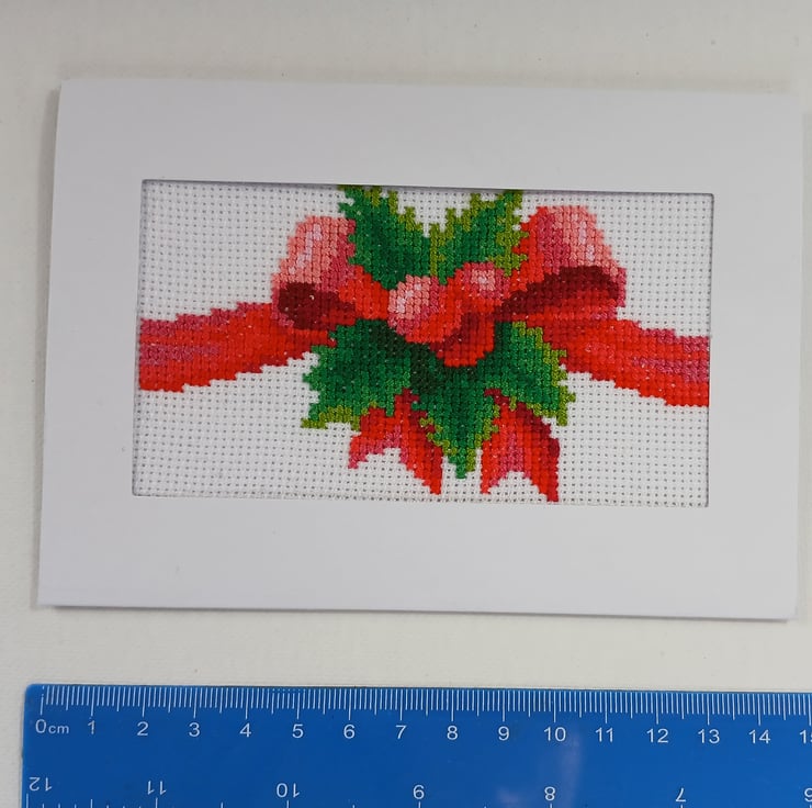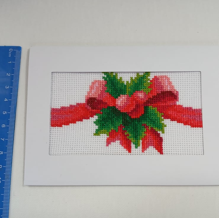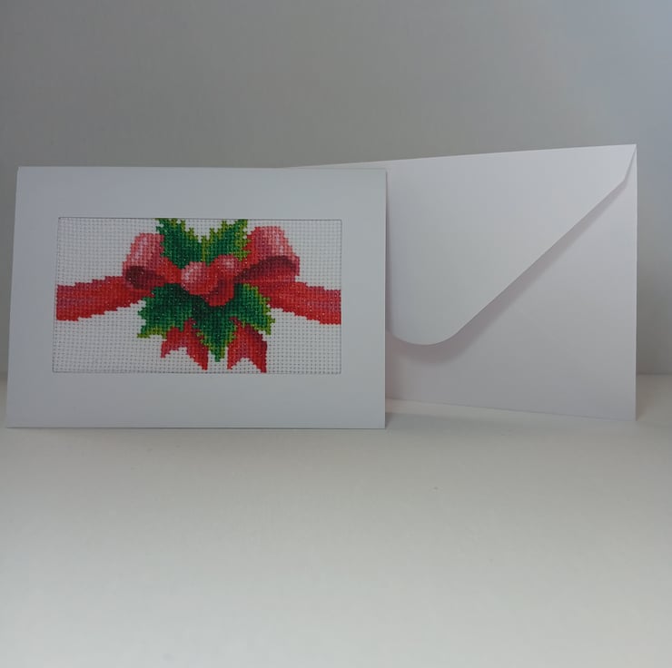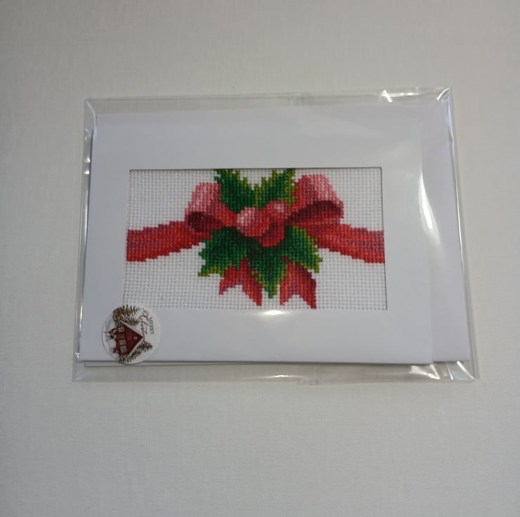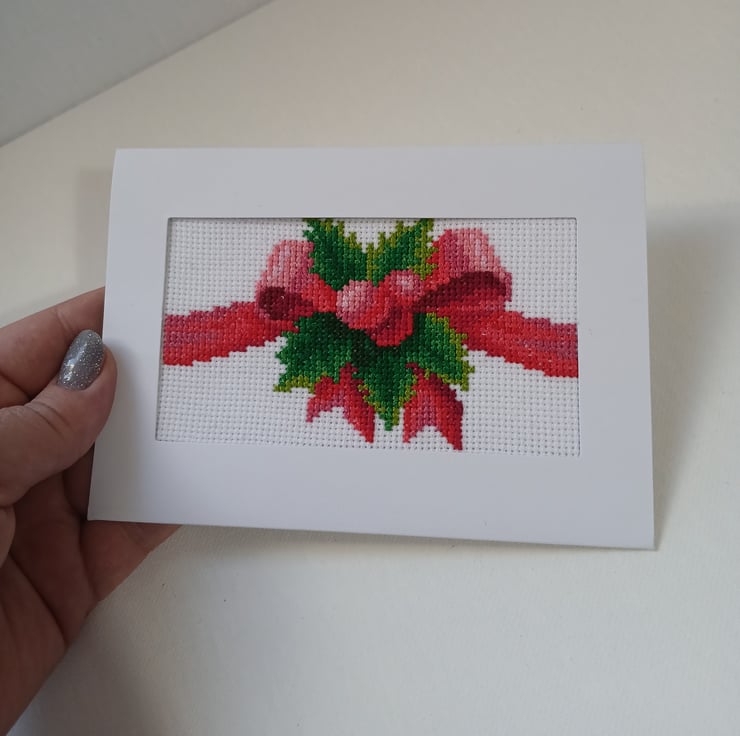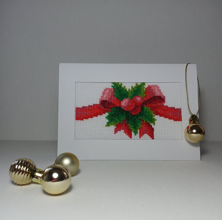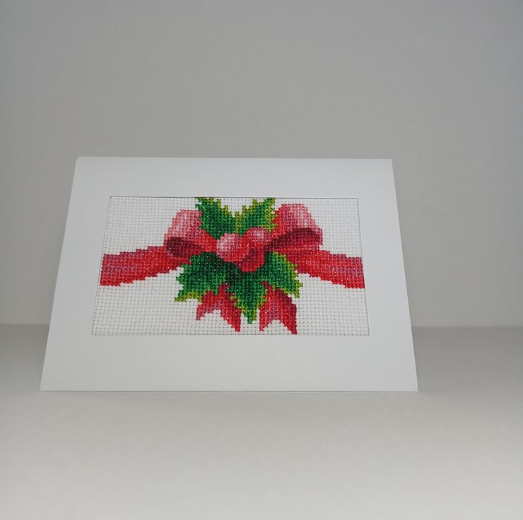 Handmade Cross-Stitch Christmas Card – Festive Red Bow with Holly Leaves
