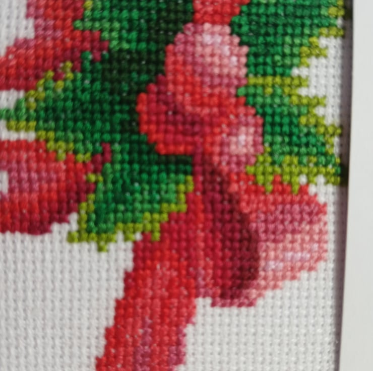 Celebrate the season with this beautifully handcrafted Christmas card featuring an intricate cross-stitch design of a red ribbon bow nestled among vibrant green holly leaves and berries. Each stitch is lovingly placed on fine white Aida cloth, framed within a crisp white card — perfect for sending heartfelt holiday wishes or gifting as a keepsake.