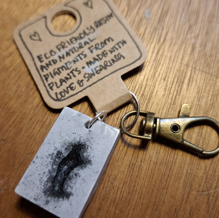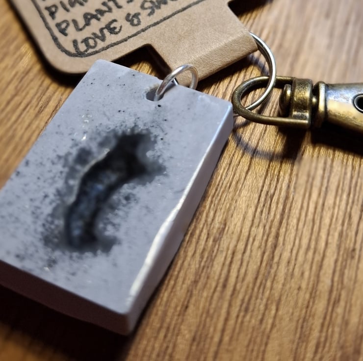 This rectangle-shaped keyring is made from an eco-friendly, non-toxic resin, mixed with a natural plant pigment (also handmade). The pitting you see on the design is a natural chemical reaction between the two.