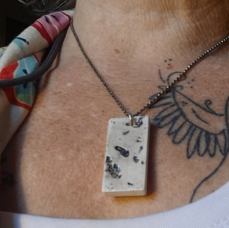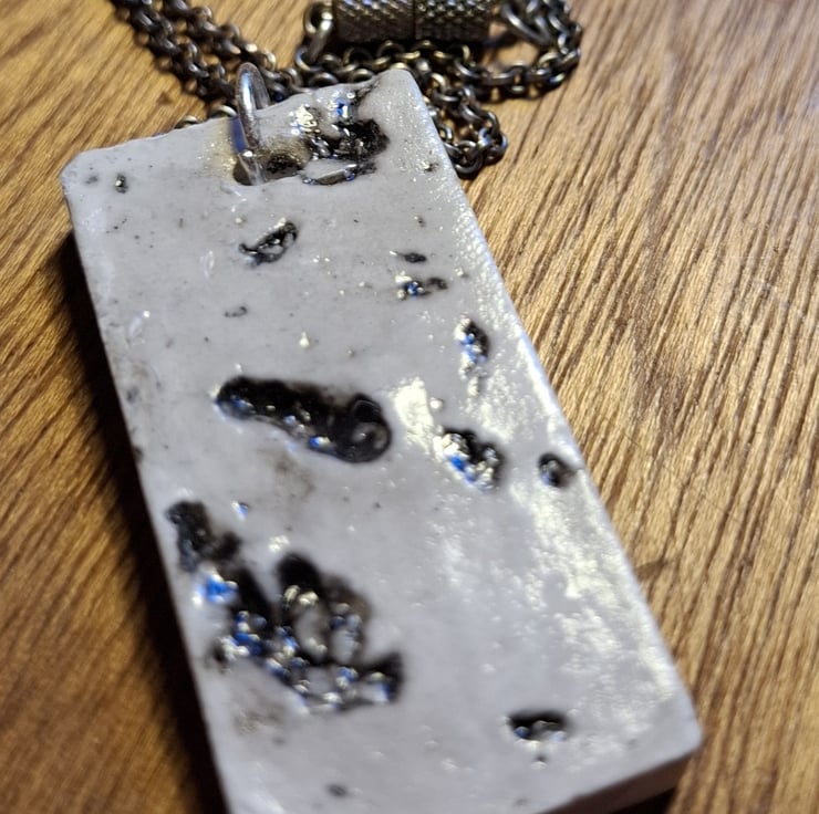 This is a rectangular resin pendant mixed with a handmade charcoal pigment to create this almost moon-like effect.