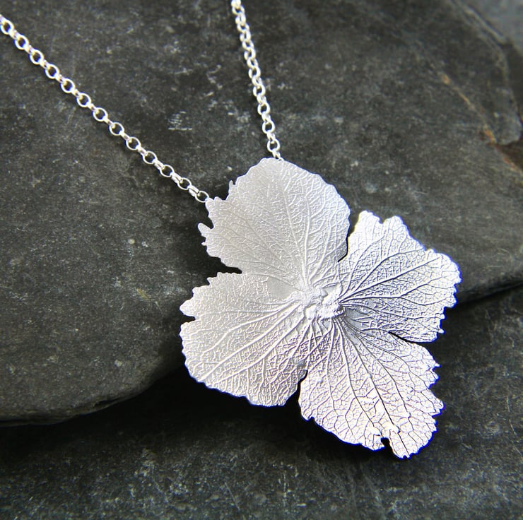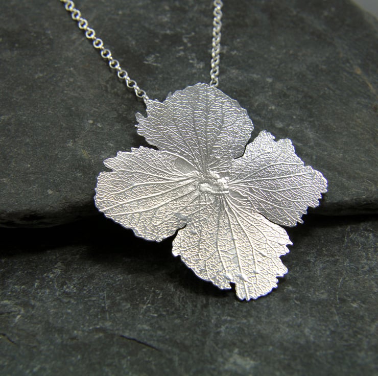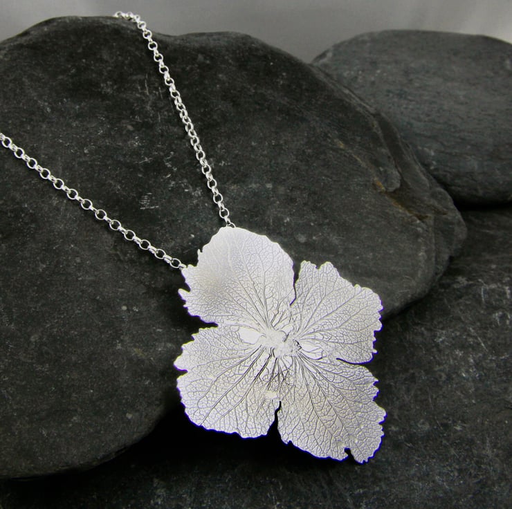 This beautiful statement pendant is part of a small and exclusive, limited edition collection of one of a kind, unique pieces of jewellery. Inspired by the delicate and strong skeleton Hydrangea petals that I collected from my very own corner of Cornwall. Each flower or petal has been used only once, giving each piece a completely unique DNA, much like a fingerprint. The process of embossing that into the metal is delicate and precarious, but I hope you agree the results are just so, so special!