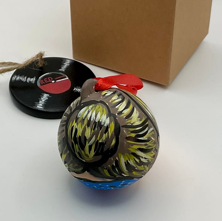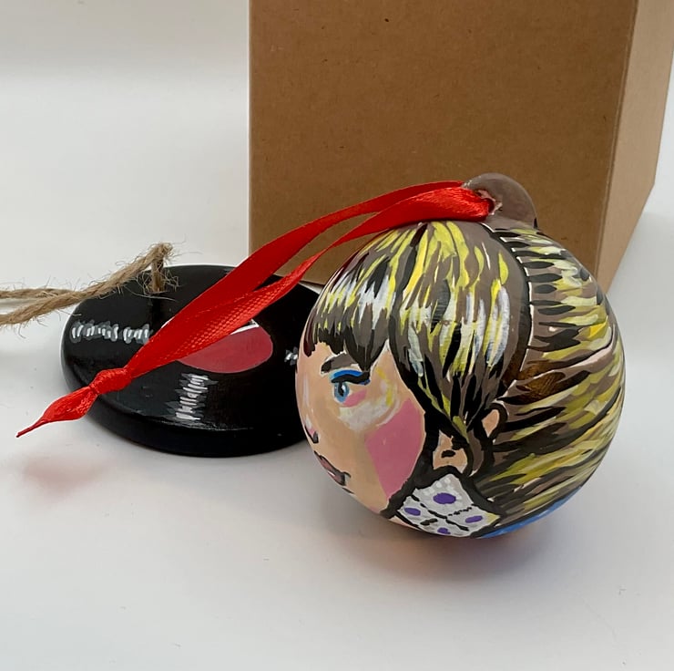 This is a hand painted set including; a box which has been painted with a still from the All Too Well video, a ceramic bauble painted to illustrate the singer from the Grammy awards where she won best video for All Too Well, and a hand painted ceramic hanging decoration of the Red record. This entire set is varnished to give a beautiful finish. It is a one of a kind set perfect for the Swiftie in your life as an original and unique gift.