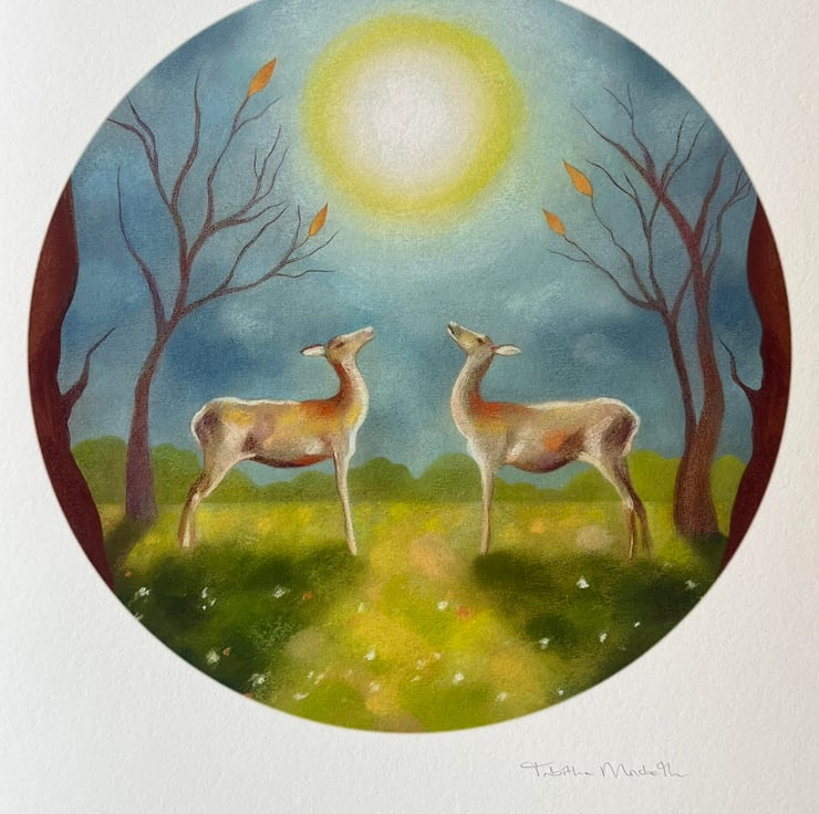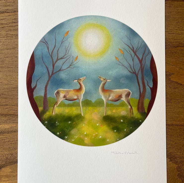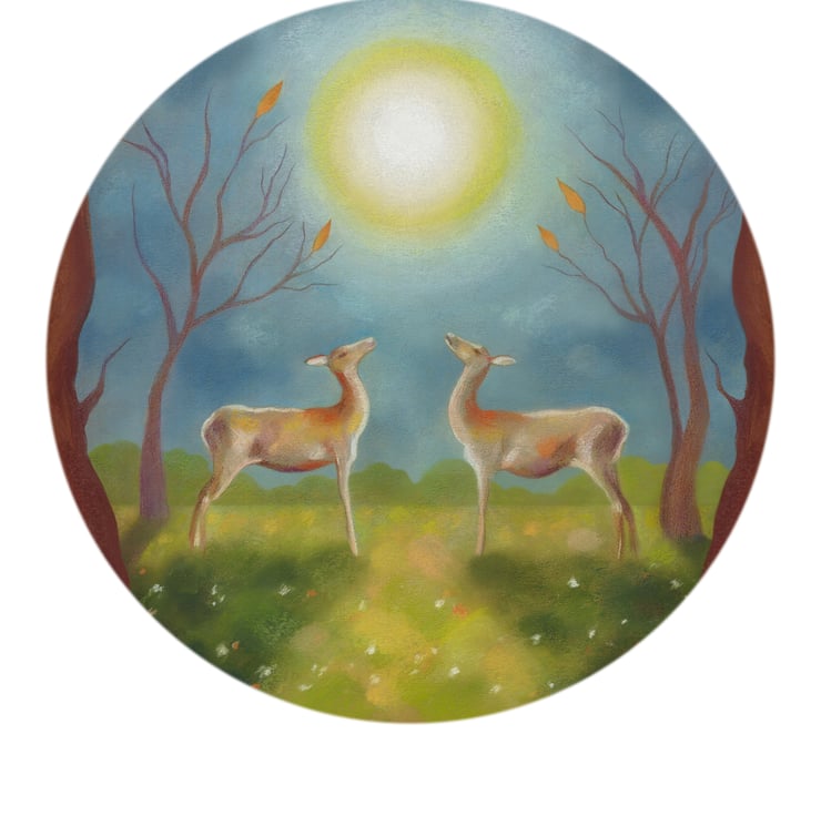 I used pencils and chalk pastels to create this delicate illustration of two red deer basking in a glow of light. The circularity of the piece, as well as the symmetry and mirroring of the deer and trees, creates a peaceful and contemplative feeling.