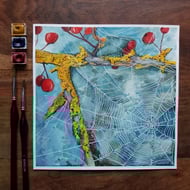 My artwork was inspired by our walks over the hills when I really enjoy collecting plant treasures from the hedgerows and trees. I included some hawthorn berries, pine cone, horse chestnuts, hazelnuts, rosehips and sycamore seeds. I added a book bag and a library card as I always think of foraging in the hedgerows as a similar activity to finding books in a library. This artwork would make a unique gift for someone who likes walks in the country side and reading.