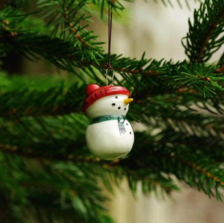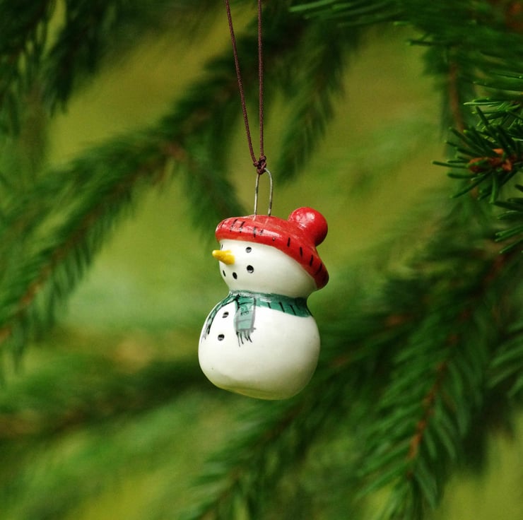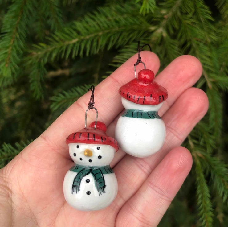 These snowmen are hand-built using earthstone clay and glazes fired in an electric kiln.