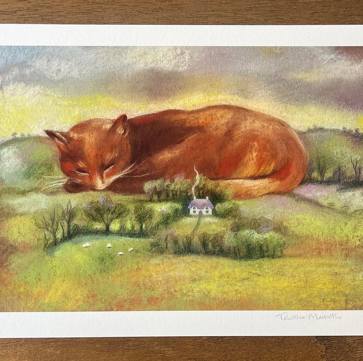 I created this gently surreal drawing with pastels and pencils on toned paper, having been inspired by a recent visit to beautiful Dartmoor, Devon. Looking out at the view from Brent Tor, I was struck by an orange-brown hill in the midst of all the green, and my imagination turned it into a giant, sleeping, orange cat! The tiny fields and house seem very cosy and protected by the presence of the slumbering cat!