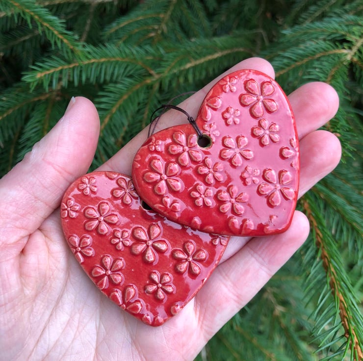 These hearts are hand-built using stoneware clay and glazes fired in an electric kiln.