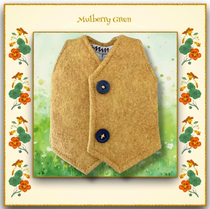 A lovely classic mustard tailored felt waistcoat, lined with pure cotton in a gold leaf print, to fit the Mulberry Green characters. The waistcoat is made from best quality wool felt and is finished off with two little buttons with poppers underneath.