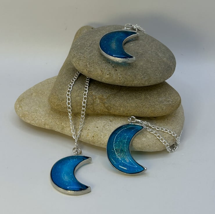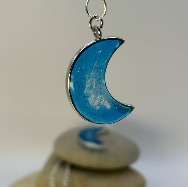 A gentle tribute to moonlight and magic, captured in every curve of hand-poured resin. These crescent moon pendants are crafted in a range of dreamy colours: deep midnight blue, clear sparkle, half-and-half white and crystal, opaque white or teal shimmer. Each piece is shaped by hand and finished with care, suspended on an 18" silver-plated chain that catches the light beautifully. A thoughtful gift or a personal keepsake for anyone drawn to the quiet wonder of the night sky.