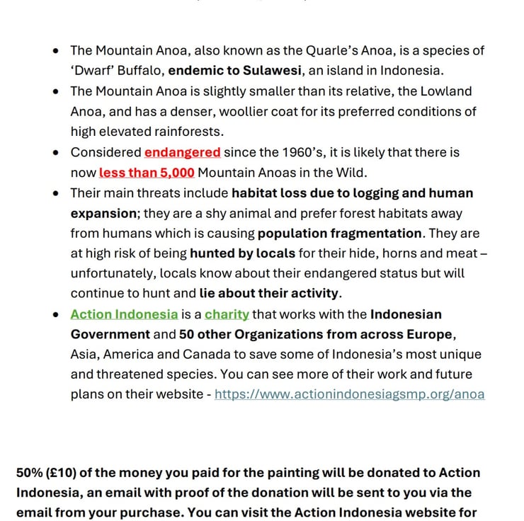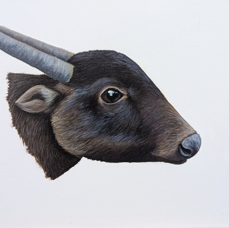 This acrylic painting on a 12" x 9" canvas depicts a portrait of a Mountain Anoa, an endangered Indonesian Dwarf Buffalo, please see the third image for more personal information on the Mountain Anoa, or visit the charity website actionindonesiagsmp.org to learn more about their conservation efforts for the animals.