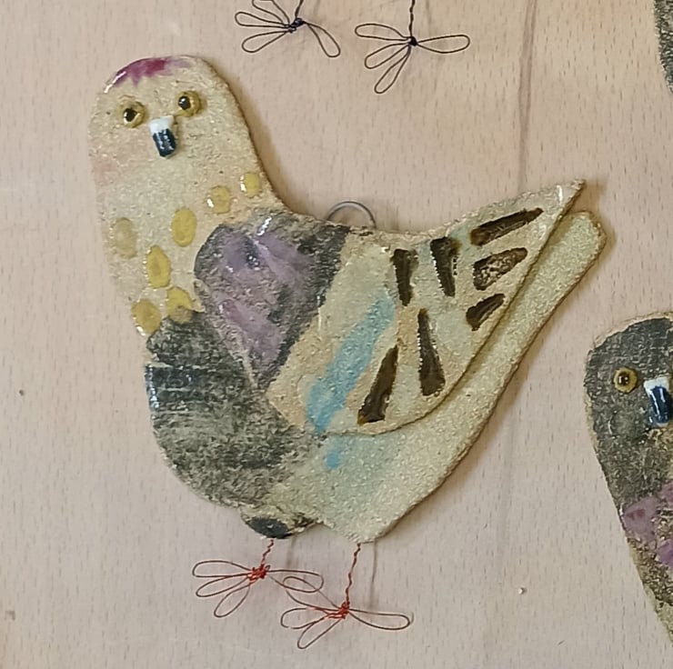 Pinky is a stoneware pigeon decorated with slips and glazes and finished with red wire feet.