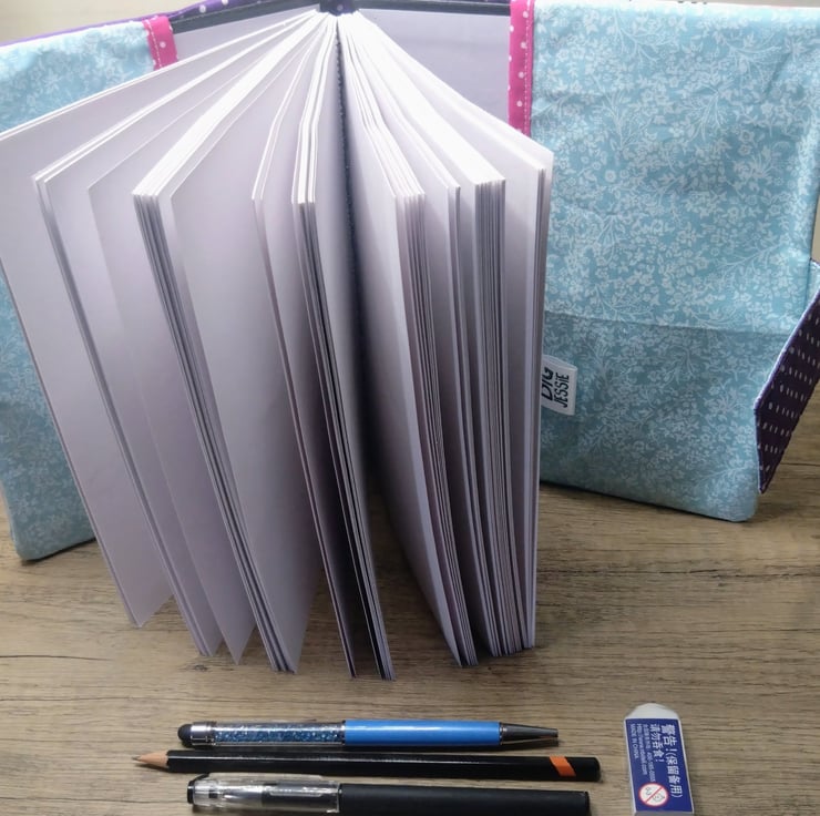 The sketchbook has 80 pages and is a hard cover wire bound book. The fabric cover can be reused once the book is filled.