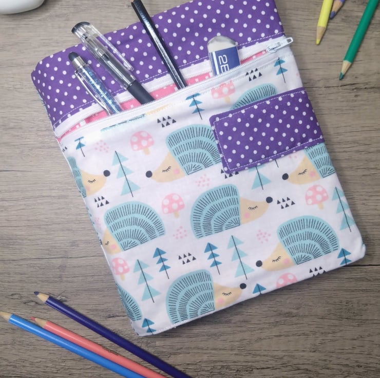 An A5 sized blank sketchbook with a reusable fabric cover featuring a hedgehog pattern. The cover has a zip pouch on the front for pens, pencils and other sketching materials.