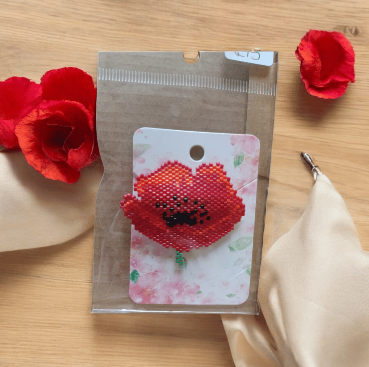 A beautiful seed bead red poppy brooch with orange highlights, a black centre and short green stem, this brooch is ideal for Rememberance or just for those who love poppies and flowers in general. The brooch is approximately 5cm wide by 4cm high at its longest points and has a silver clasp on the back with a secure fastening. A minimum of 10% of the profit from the sale of this brooch will be donated to the Royal British Legion poppy appeal.