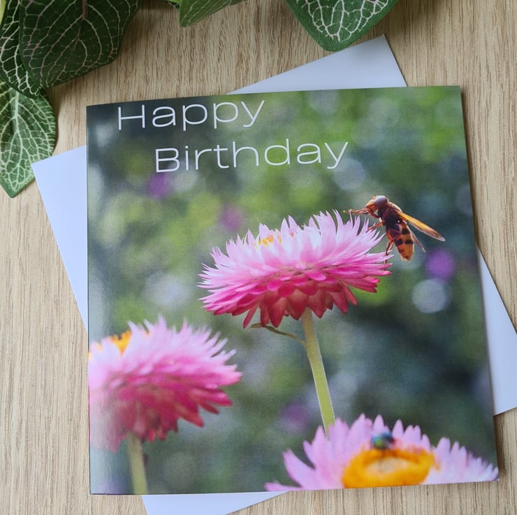 This card is a print from a photo I took in my garden of a bee on a strawflower. This is a perfect card for any flower lover, bee lover or gardener.