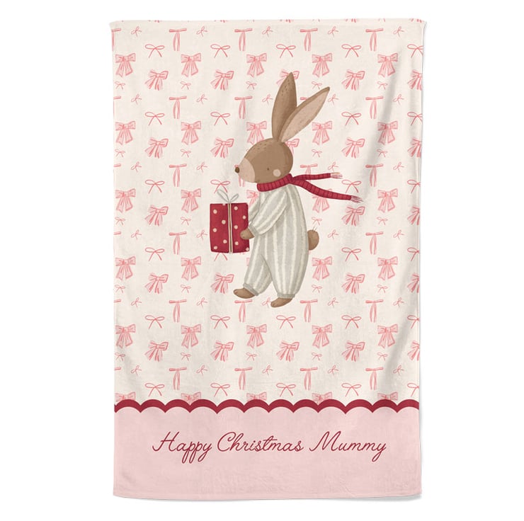 This delightful 'Festive Bunny' personalised Christmas tea towel will add a touch of pretty pink charm to your kitchen. Featuring an adorable bunny in cosy striped pyjamas against a backdrop of little pink bows, this sweet coquette style tea towel is made from 100% cotton. Machine washable and with a stitched in hanging loop, it is ideal for everyday use throughout the festive season and makes a really sweet Christmas gift for a loved one.