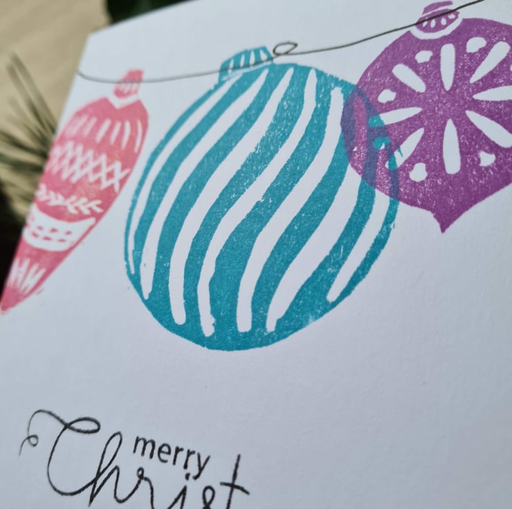 This bauble christmas card is made using stamps that I have designed and carved myself. I use quality stamp pads to give lovely, bright colours. This would be a unique card to give a close friend or relative.