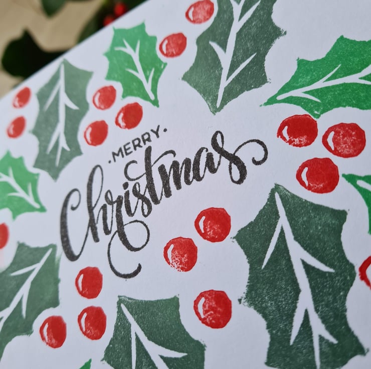 This Christmas card features holly leaf and berry stamps which I've carved and printed myself. Handmade cards are a thoughtful and lovely gift for close friends and family.