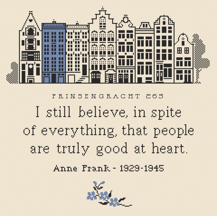 Anne Frank quote and Forget-me-nots. The building at the top shows the home where she and her family spent in hiding. Remembrance Day cross stitch pattern (PDF Counted Chart 217B)