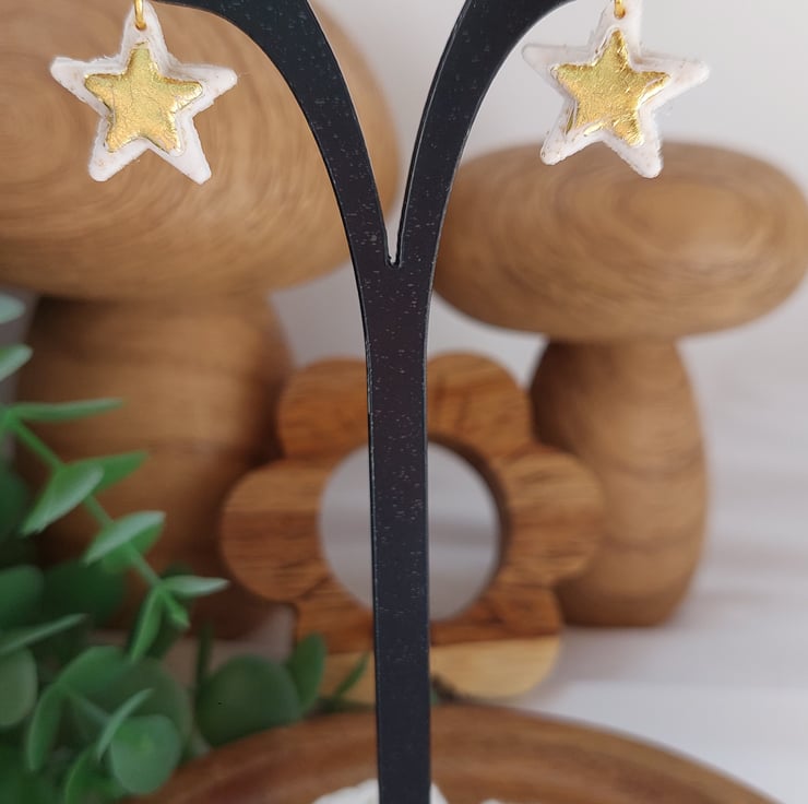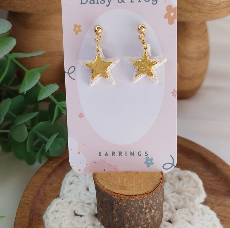 Add a touch of sparkle to your look with these playful double star dangles. Featuring a tiny gold star nestled inside a larger white star, each earring is crafted from lightweight polymer clay and accented with shimmering imitation gold leaf. The 24k gold-plated stainless steel ball stud and jump ring create a charming drop effect that dances with every move. Perfect for festive fun or everyday shine!