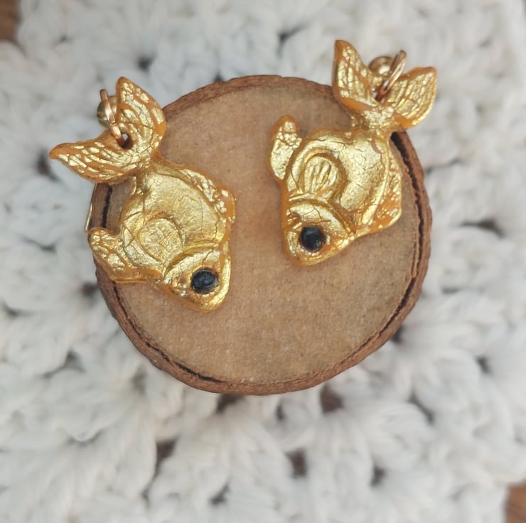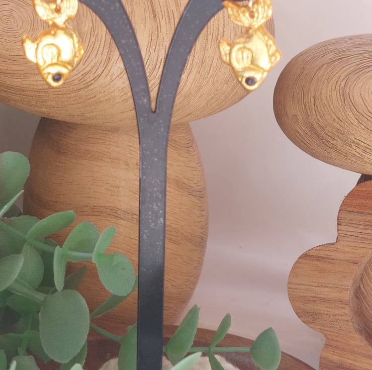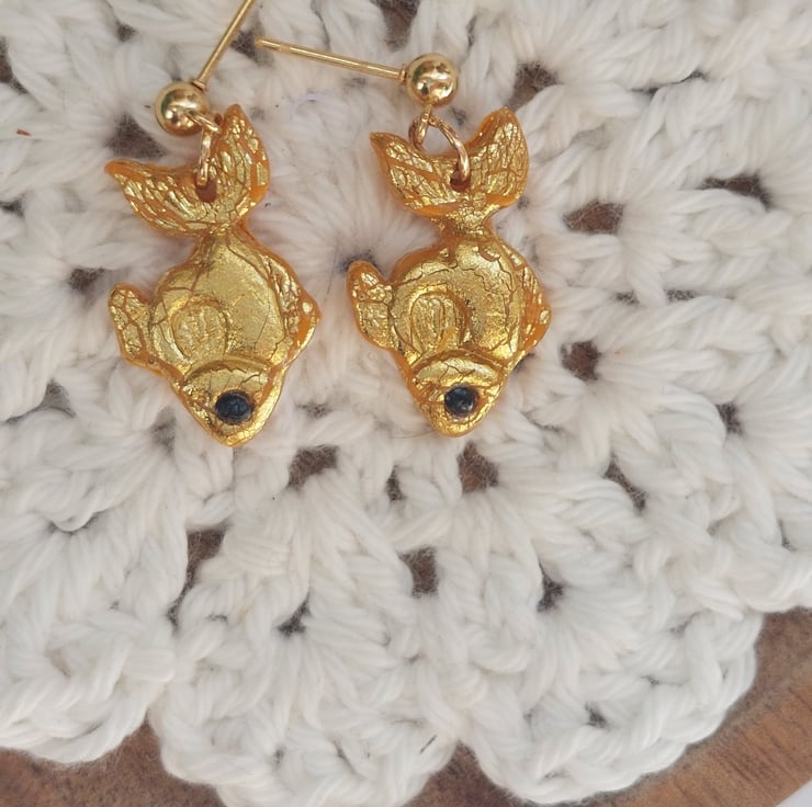 Add a splash of whimsy to your look with these playful goldfish dangle earrings. Crafted from vibrant orange polymer clay and shimmering with imitation gold leaf, each fish gleams under a high shine varnish. The 24k gold plated stainless steel jump ring and ball stud post ensure a secure, stylish fit that’s perfect for everyday fun or special occasions. Let these charming earrings bring a touch of underwater magic to your outfit!
