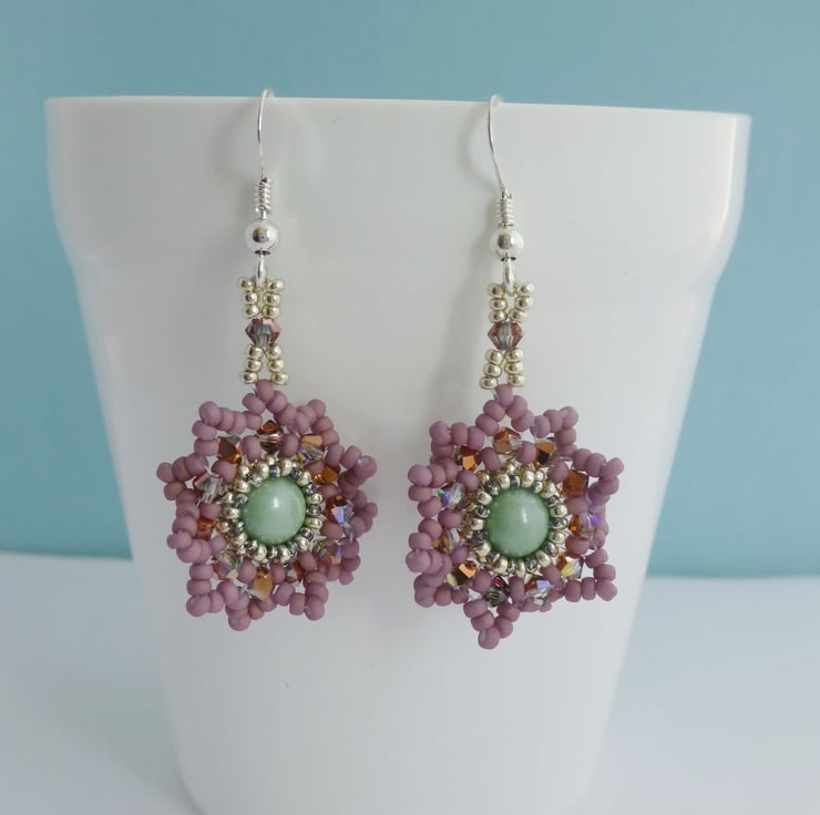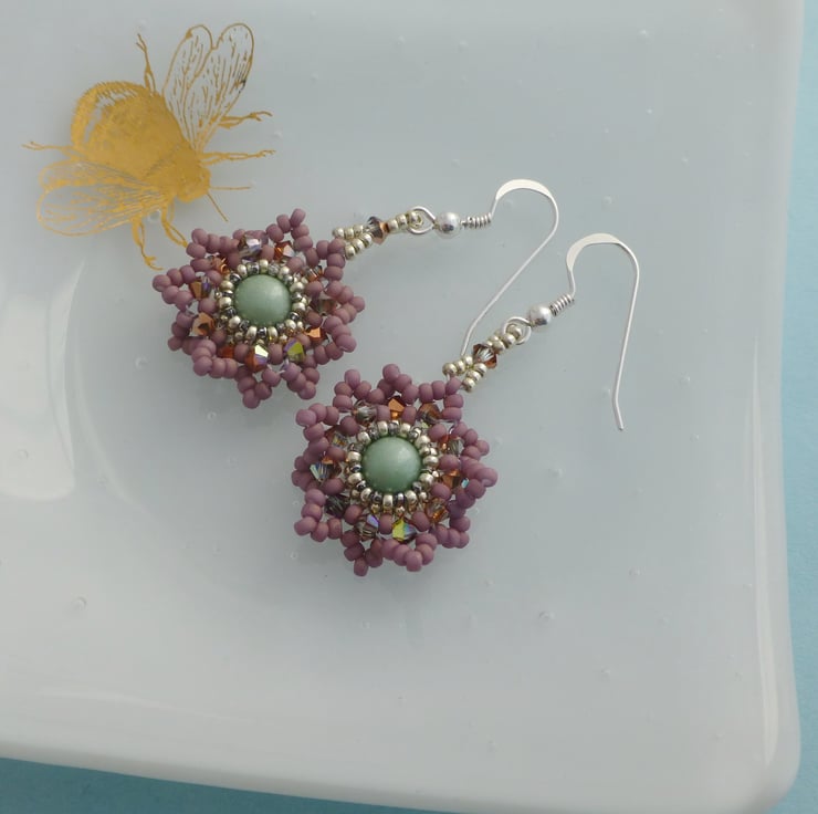 These pretty hand beaded flower earrings are a lovely combination of vintage looking colours including dusky pink, copper, pastel green and silver.
