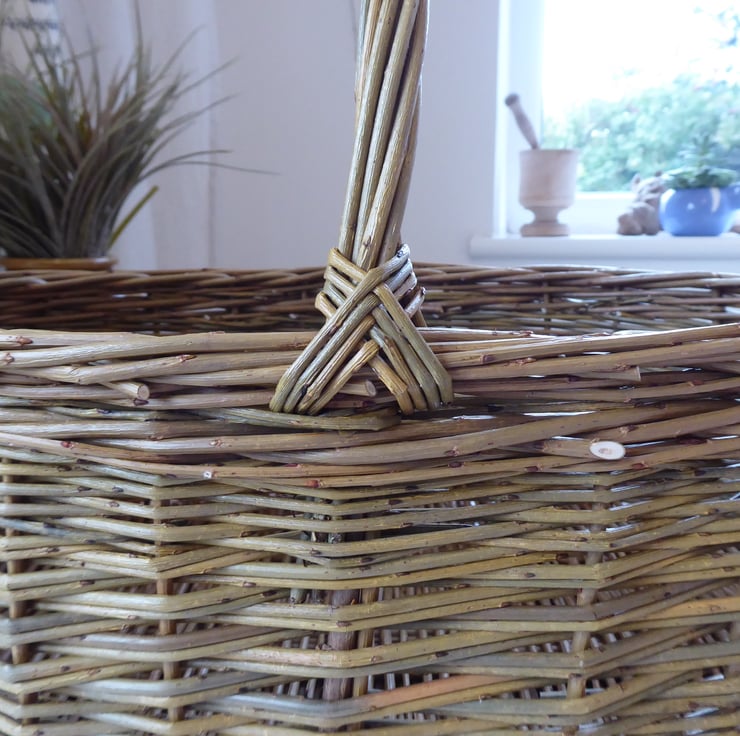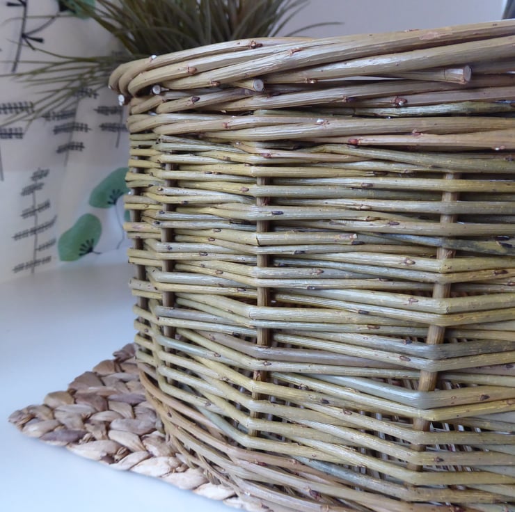I love the subtle tones of green from the Dicky Meadows in this basket. The sides are made using a French Rand weave of single and double willow which creates a pattern on the sides.