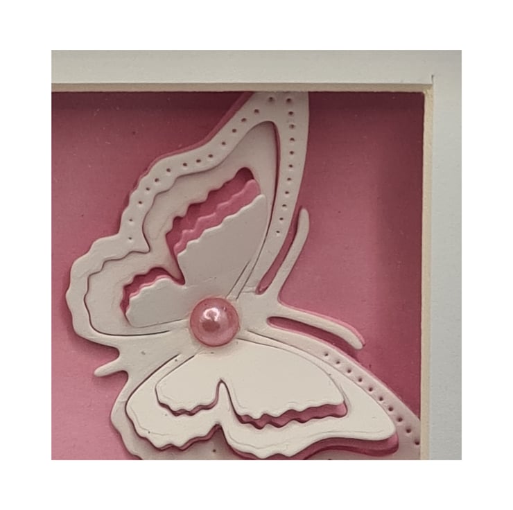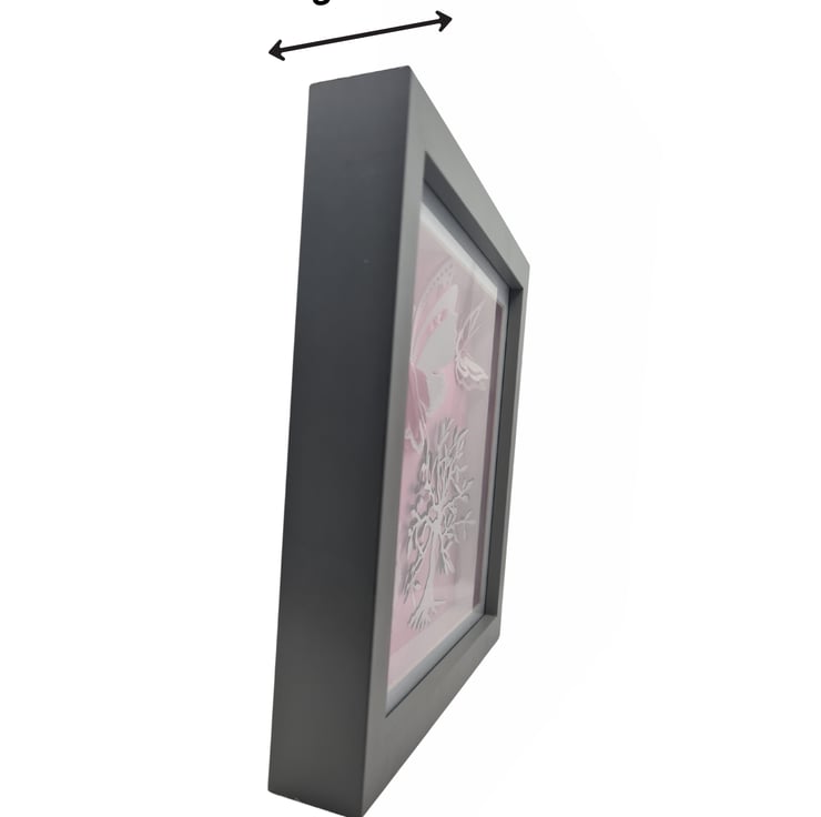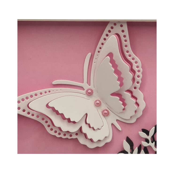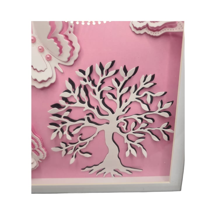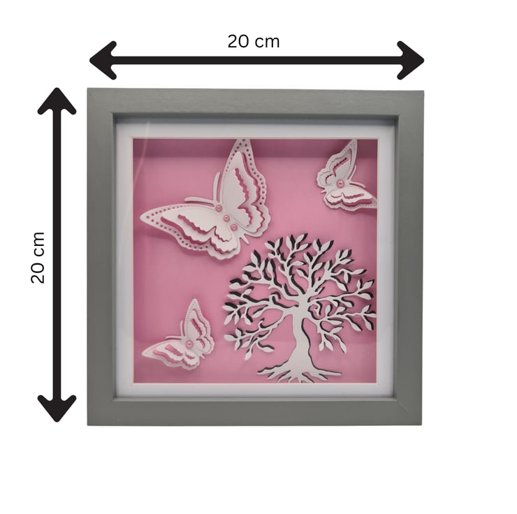 This enchanting handmade shadow box features delicate paper-cut butterflies in soft white with pink accents, gracefully fluttering around an intricate Tree of Life silhouette. Crafted with multiple layers of premium card for a stunning 3D effect, the design sits against a vibrant pink background, creating depth and movement. Perfect as a thoughtful gift or to add a touch of serenity to your home. Measurements: 20 cm x 20 cm x 3 cm depth. Framed in a modern grey shadow box frame, ready to hang.