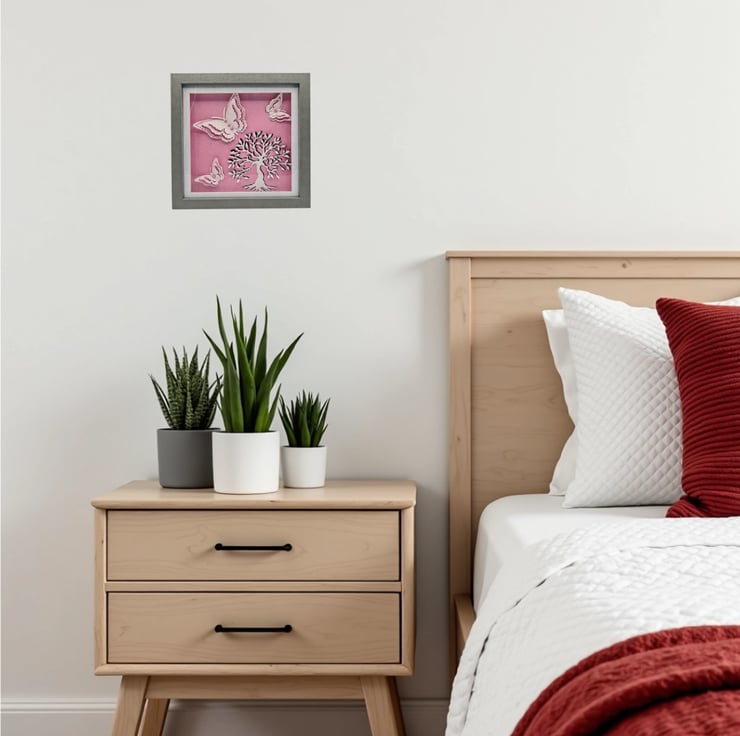 Visualise this beautiful Butterfly and Tree of Life shadow box in your own space – shown here styled above a bedside table in a cosy bedroom setting. The layered paper-cut design showcases elegant butterflies encircling the symbolic Tree of Life, all in crisp white and pink tones on a bold pink backdrop. Handcrafted with care for a captivating 3D illusion. Ideal for nurseries, living rooms, or as a meaningful present. Measurements: 20 cm x 20 cm x 3 cm depth. Comes in a sleek grey frame, complete with hanging fixtures.