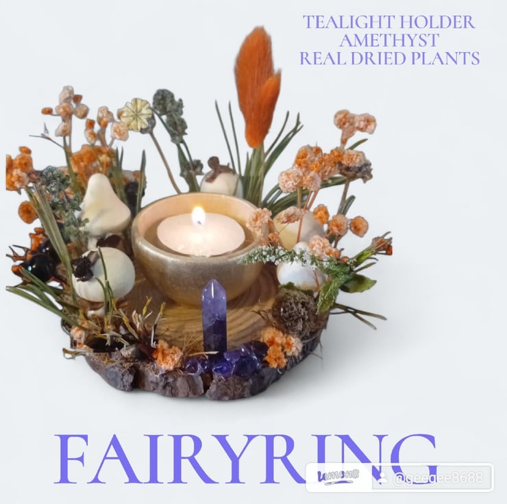 This has been beautifully handmade by our green witch GeeGee. They are made using a wood slice and have added dried plants and seeds along with wooden mushrooms and crystals. This candle holder is perfect for that fairycore lover. Its been lovingly created with fairies in mind. The Amethyst crystals are added for protection and spiritual growth. Bring alittle magic to your home with this one of a kind piece.