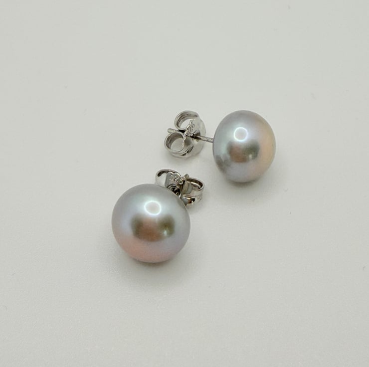 Discover the elegance of our 12mm grey button freshwater pearl earrings, a perfect blend of sophistication and style. Set in luxurious sterling silver, these earrings are designed to catch the light beautifully, adding a touch of glamour to any outfit.
