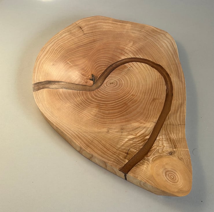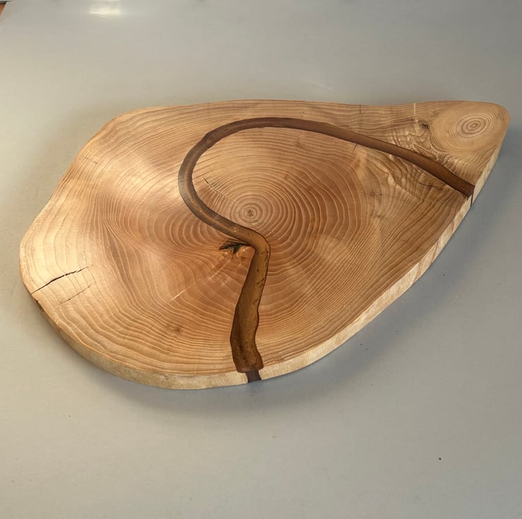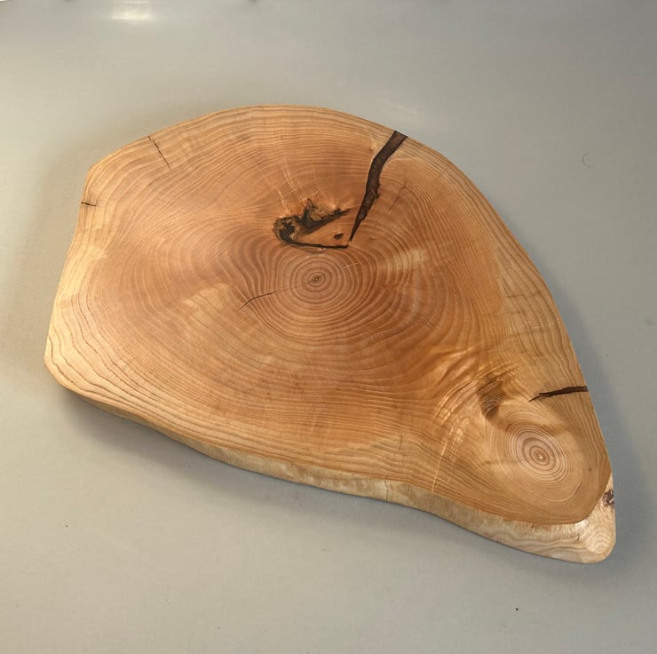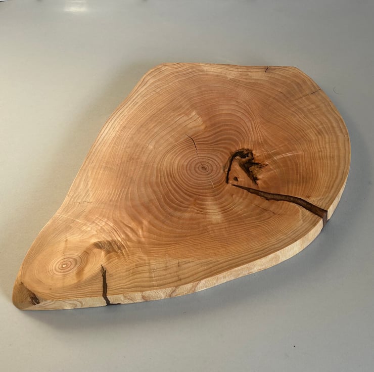 The ash has been sliced, surfaced and dried for around two years, I then assess the surface and if necessary do an epoxy resin pour into any cracks and holes. The boards are then sanded to 240grit and get three coats each side of a food safe, water based finish. The board is at its maximum 430mm long, by 300mm wide, by 23mm thick, it weights 1.6 kg. To keep them looking their best please only use warm water and a very mild detergent to clean.