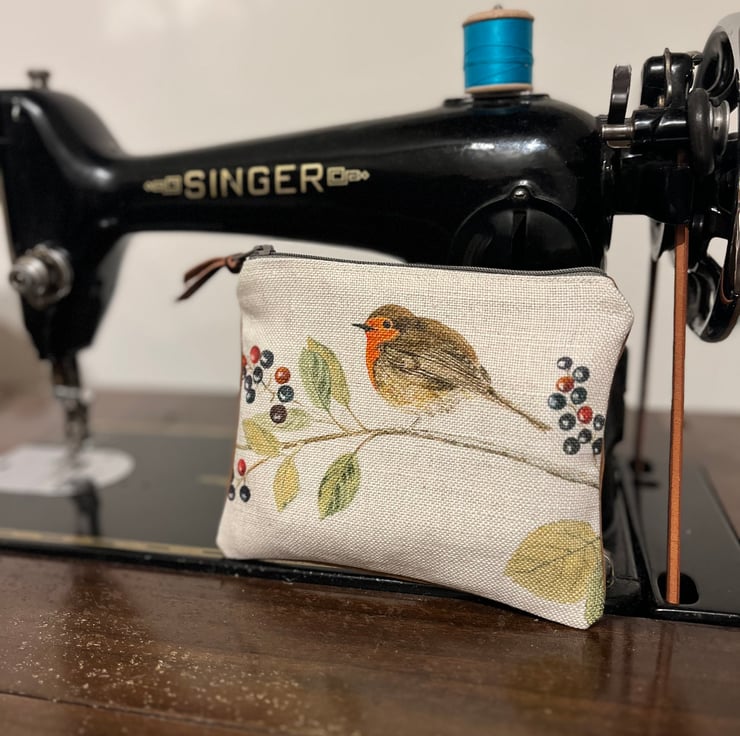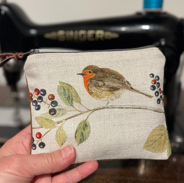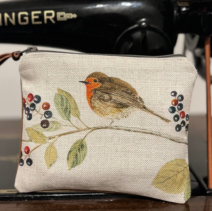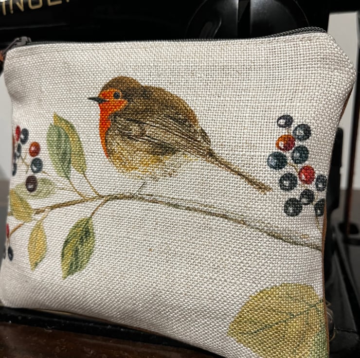 Pretty small pouch with a robin and berries on the front. The back is a tan moleskin fabric. The pouch is lined with spotty beige cotton. All the fabrics came from sample swatches.